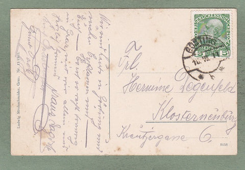 AK Ruine Gösting bei Graz. Gelaufen 1911. Kleinformat. Verlag: Strohschneider. Nummeriert: 11. 1911. Zustand: linkes oberes Eck angeknickt, auf Vorderseite beschrieben, sonst leichte Läsuren.