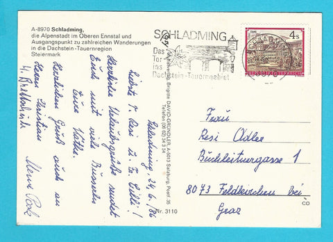 AK Grüße aus Schladming. Gelaufen. Großformat. Verlag: Cosy. Nummeriert: 3110. Zustand: rechtes oberes Eck geknickt.