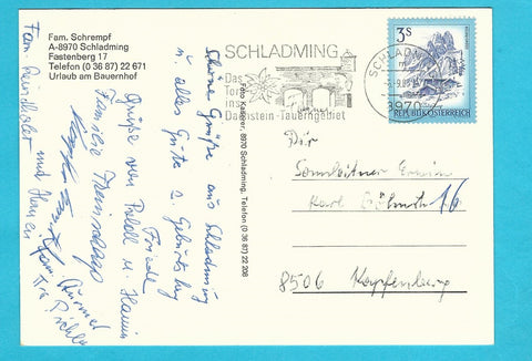 AK Schladming. Pension Breilerhof. Fam. Schrempf. Fastenberg 17. Gelaufen. Großformat. Verlag: Kaserer. Zustand: gut.