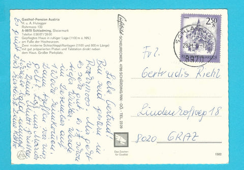 AK Schladming. Gasthof Pension Austria. H. u. A. Hutegger. Rohrmoos 133. Gelaufen. Großformat. Verlag: Luftbild Scheurecker. Nummeriert: 1502. Zustand: gut.