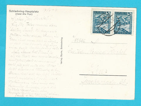 AK Schladming-Hauptplatz. Hotel Alte Post. Gelaufen. Großformat. Verlag: Styria. Zustand: kleiner Einriss am rechten Rand, sonst leichte Läsuren.