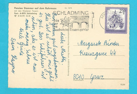 AK Schladming. Pension Stammer auf dem Rohrmoos. Gelaufen. Großformat. Verlag: Broer. Nummeriert: 1074. Zustand: gut, linkes unteres Eck geknickt.