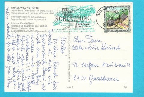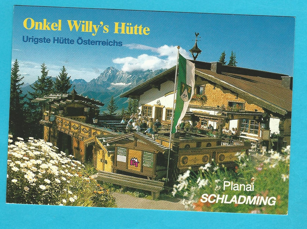 AK Schladming. Planai. Omkel Willy' Hütte. Inhaber: Familie Thaler. Gelaufen. Großformat. Verlag: Cosy. Nummeriert: 3114 A. Zustand: gut, untere Ecken angeknickt.