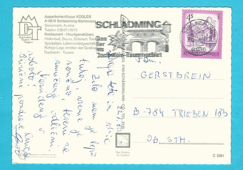AK Schladming Rohrmoos. Appartementhaus Kogler. Gelaufen. Großformat. Verlag: Luftbild Scheurecker. Nummeriert: C 2081. Zustand: rechtes unteres Eck doppelt geknickt, sonst O.k.