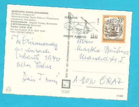 AK Schladming. Sporthotel Royer. Gelaufen. Großformat. Verlag: Luftbild Scheurecker. Nummeriert: C 1820. Zustand: linkes oberes Eck geknickt.