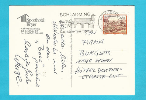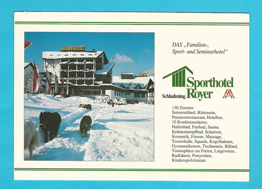 AK Schladming. Sporthotel Royer. Gelaufen. Großformat. Verlag: Lang. Zustand: linkes oberes und rechtes unteres Eck angeknickt, Knick am oberen Rand in der rechten Hälfte.