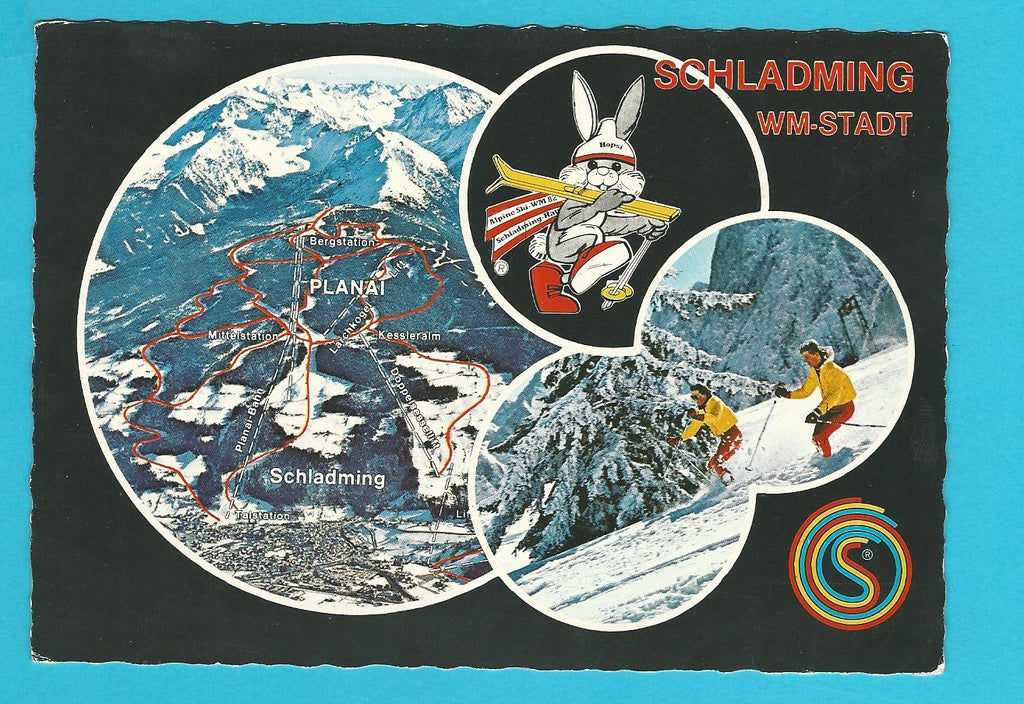 AK Schladming WM-Stadt. Gelaufen. Großformat. Verlag: Luftbild Scheurecker. Nummeriert: 3001. Zustand: Knicke über dem linken unteren Eck.