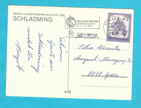 AK Schladming. World Championships Ski-Alpin 1982. Gelaufen. Großformat. Verlag: Jost. Zustand: Knick am unteren Rand in der rechten Hälfte, sonst leichte Läsuren.