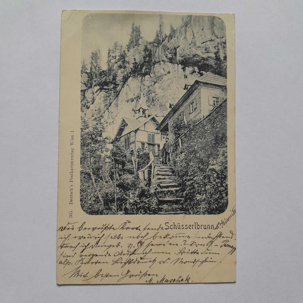 AK Schüsserlbrunn. Gelaufen. Kleinformat. Verlag: Deutsch's Postkartenverlag. Nummeriert: 365. Zustand: gut, linkes oberes Eck geknickt.