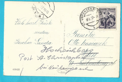 AK St. Lorenzen im Mürztal. (1951-52) Gelaufen. Kleinformat. Verlag: Frank. Nummeriert: 618-23. Zustand: linke Ecken angeknickt, sonst leicht bestoßen.
