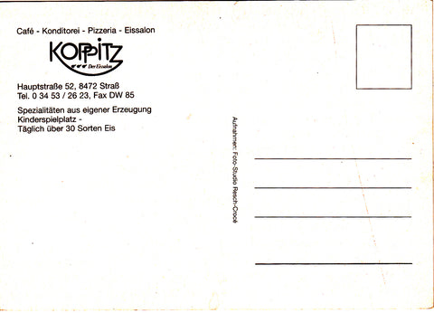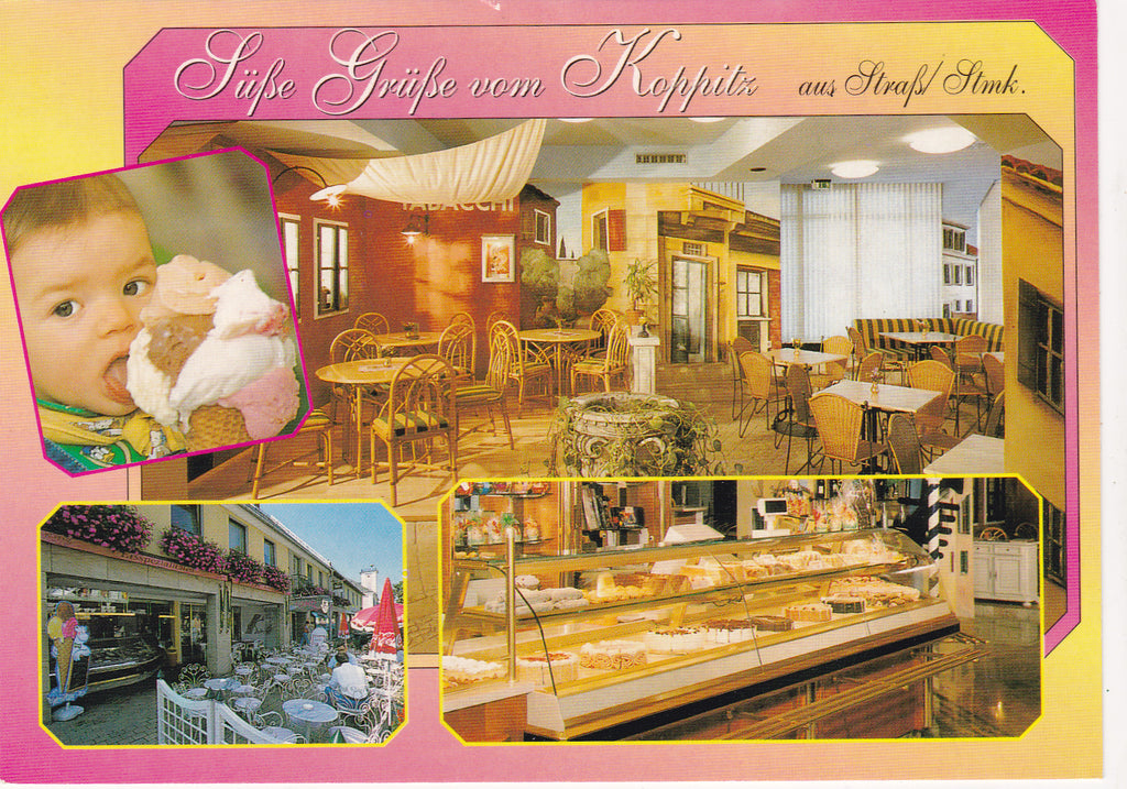 AK Süße Grüße vom Koppitz aus Straß. Cafe – Konditorei – Pizzeria – Eissalon. Gauptstraße 52. Ungelaufen. Großformat. Verlag: Foto Studio Resch-Croce. Zustand: gut.