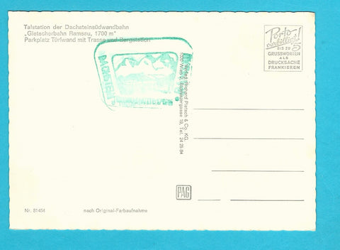 AK Talstation der Dachsteinsüdwandbahn. Gletscherbahn Ramsau. Parkplatz Türlwand mit Trasse und Bergstation. Ungelaufen. Großformat. Verlag: Pietsch. Nummeriert: 81454. Zustand: linkes unteres Eck geknickt, sonst O.k.