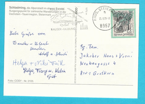 AK Urlaubsgrüße aus Schladming. Gelaufen. Großformat. Verlag: Cosy. Nummeriert: 3105. Zustand: gut, rechtes oberes Eck geknickt.