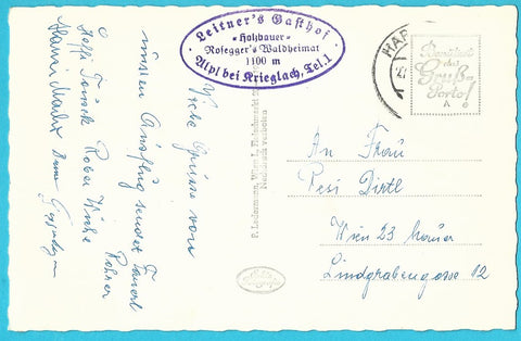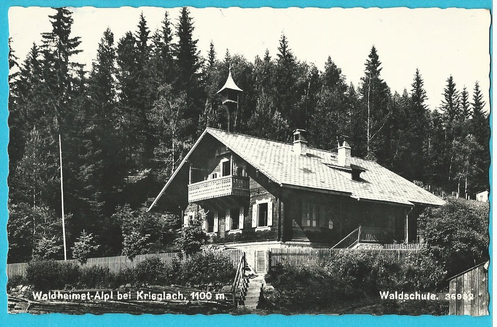 AK Waldheimat-Alpl bei Krieglach. Waldschule. Gelaufen, aber Briefmarke wurde entfernt. Kleinformat. Verlag: Ledermann. Nummeriert: 36952. Zustand: gut.
