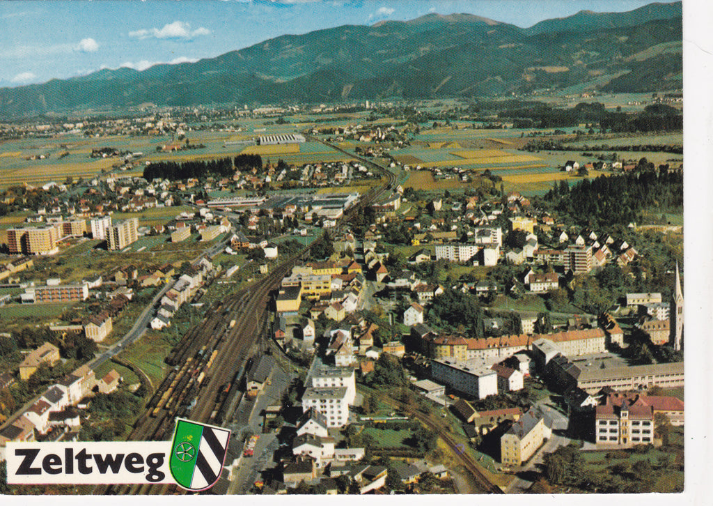 AK Zeltweg. (1987) Gelaufen. Großformat. Verlag: Hruby. Nummeriert: 6999. Zustand: gut. Luftbild.