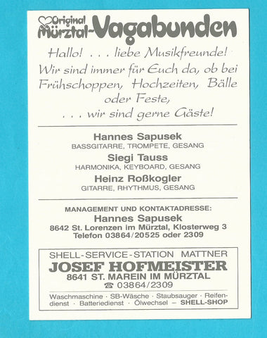 Autogrammkarte Original Mürztal - Vagabunden. Hannes Sapusek. St. Lorenzen im Mürztal, Klosterweg 3. Großformat. Zustand: gut.