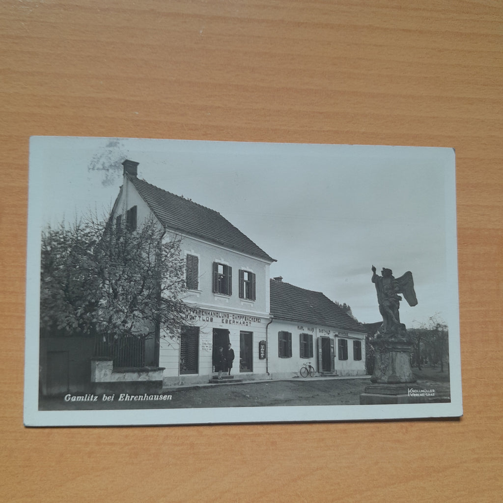AK Gamlitz. Gemischtwarenhandlung Dampfbäckerei Eberhardt. (1930) Gelaufen. Kleinformat. Verlag: Knollmüller. Nummeriert: 9008. Zustand: gut, leicht stempelfleckig.