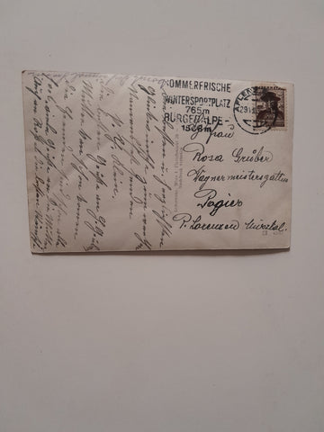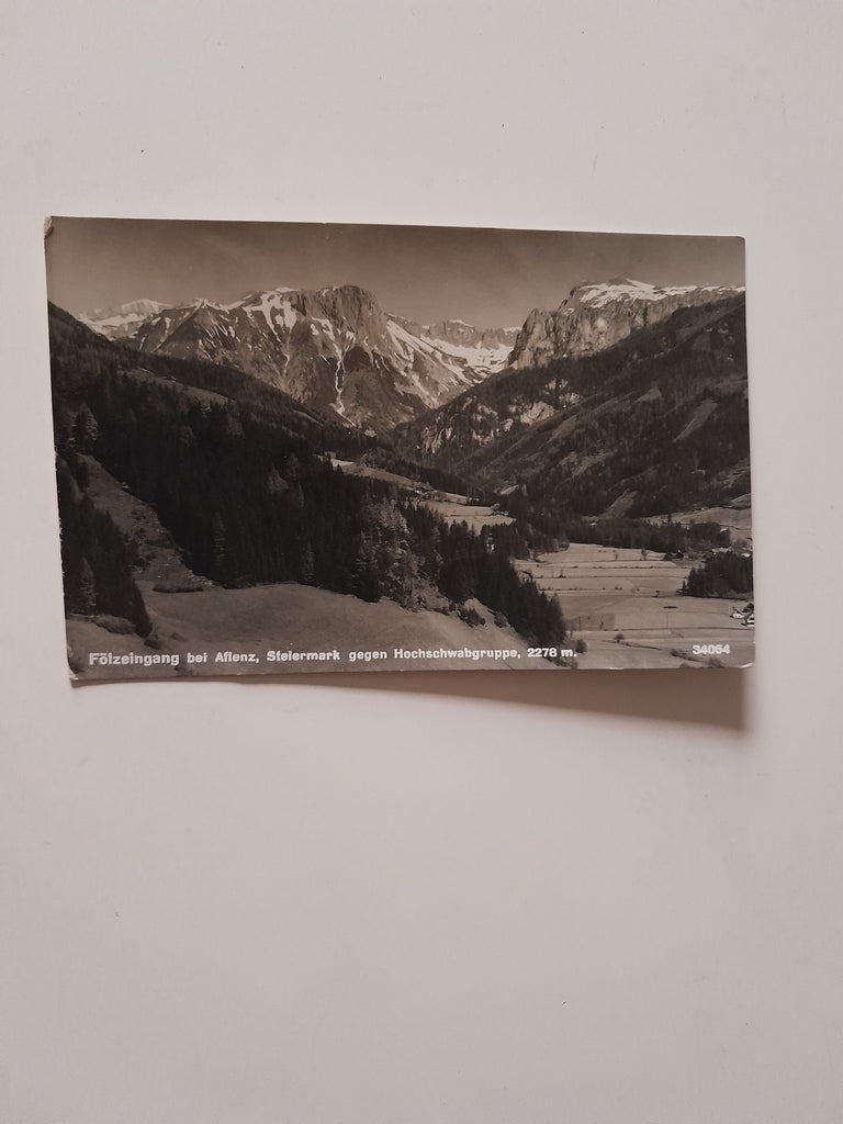 AK Fölzsteingang bei Aflenz gegen Hochschwabgruppe. (1936) Gelaufen. Kleinformat. Verlag: Ledermann. Nummeriert: 34064. Zustand: stark bestoßen.