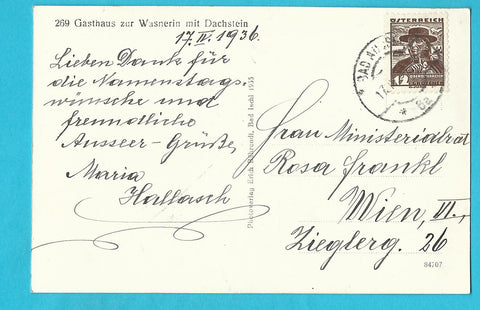 AK Gasthaus zur Wasnerin mit Dachstein. (1935) Gelaufen. Kleinformat. Verlag: Bärendt: Nummeriert: 269. Zustand: gut.