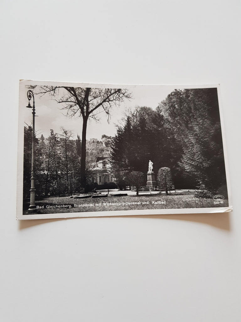 AK Bad Gleichenberg. Brunnental mit Wickenburg-Denkmal und Kaltbad. (1939-40) Gelaufen. Kleinformat. Verlag: Frank. Nummeriert: 562-40. Zustand: linkes oberes und rechtes unteres Eck angeknickt.