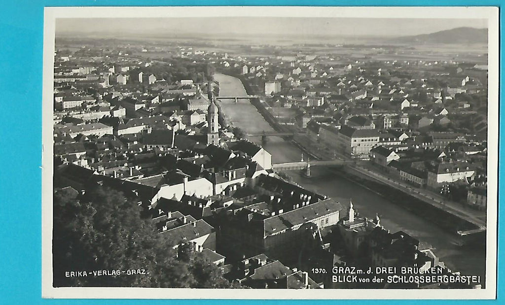AK Graz m. d. drei Brücken. Blick von der Schlossbergbastei. Ungelaufen. Kleinformat. Verlag: Steffen. Nummeriert: 1370. Zustand: Knick in Bildmitte.