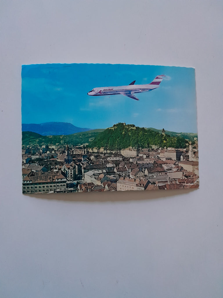 AK Graz. Blick zum Schloßberg mit AUA DC 9. Gelaufen. Großformat. Verlag: Winkler. Nummeriert: 3578. Zustand: rechtes unteres und linkes oberes Eck geknickt.