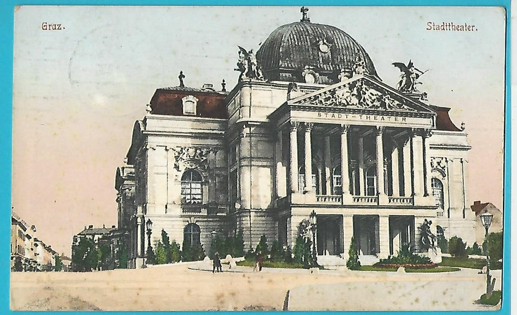 AK Graz. Stadttheater. Gelaufen. Kleinformat. Verlag: Schlauer. Zustand: stofffleckig, rechtes unteres Eck geknickt.