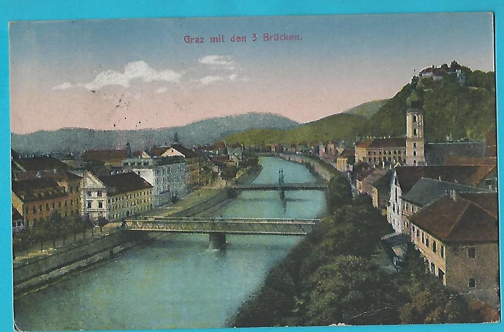 AK Graz mit den 3 Brücken. (1919/20) Gelaufen. Kleinformat. Verlag: Sussitz. Zustand: stärker bestoßen.