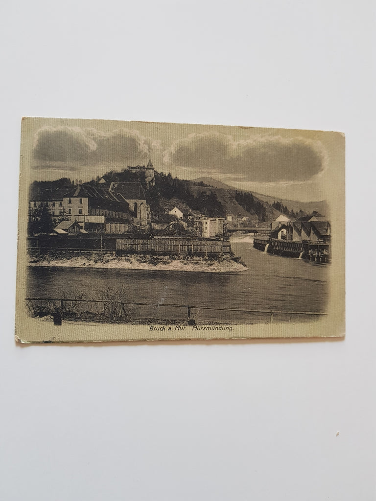 AK Bruck an der Mur. Mürzmündung. (1918-19) Gelaufen. Kleinformat. Verlag: Frank. Nummeriert: 727/28. Zustand: gut, Ecken leicht angestoßen.
