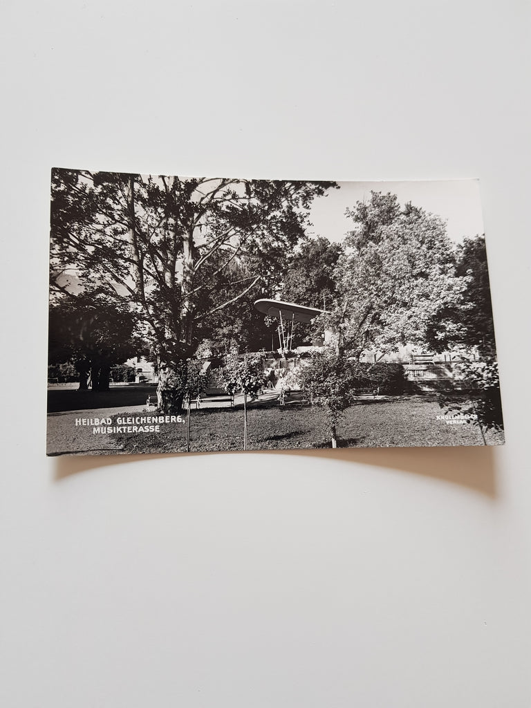 AK Heilbad Gleichenberg. Musikterrasse. Gelaufen, aber Briefmarke wurde entfernt. Kleinformat. Verlag: Knollmüller. Nummeriert: 613-.... Zustand: Knick in linker oberer Hälfte.