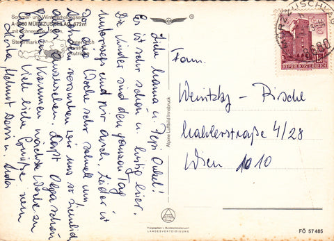AK Mürzzuschlag. Gelaufen. Großformat. Verlag: Alpine Luftbild. Nummeriert: FÖ 57485. Zustand: gut, linkes oberes Eck angestoßen.
