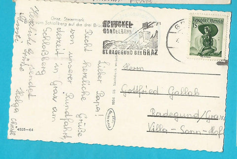 AK Graz. Blick vom Schloßberg auf die drei Brücken. (1954-55). Gelaufen. Kleinformat. Verlag: Frank. Nummeriert: 4525-64. Zustand: linkes oberes Eck geknickt.