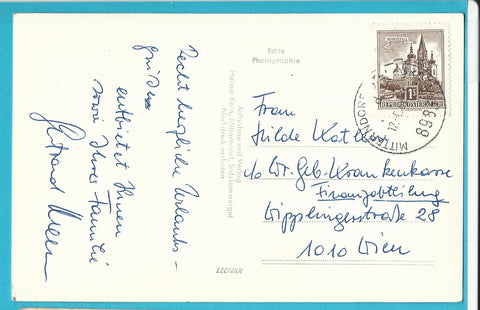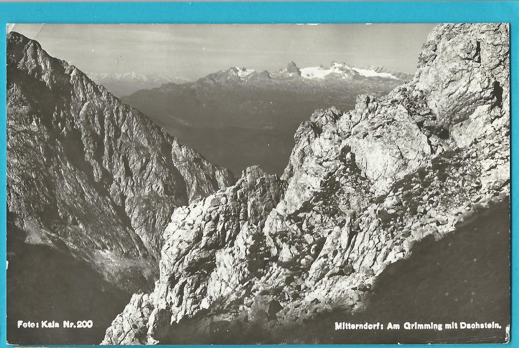 AK Mitterndorf. Am Grimming mit Dachstein. Gelaufen. Kleinformat. Verlag: Kain. Nummeriert: 200. Zustand: linkes oberes Eck und rechtes unteres Eck geknickt.