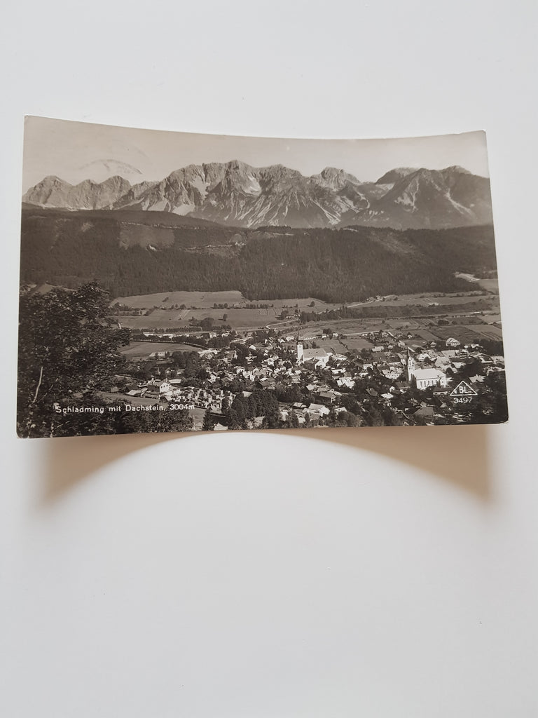 AK Schladming mit Dachstein. Gelaufen, aber Briefmarke wurde entfernt. Kleinformat. Verlag: Lenz. Nummeriert: 3497. Zustand: gut.