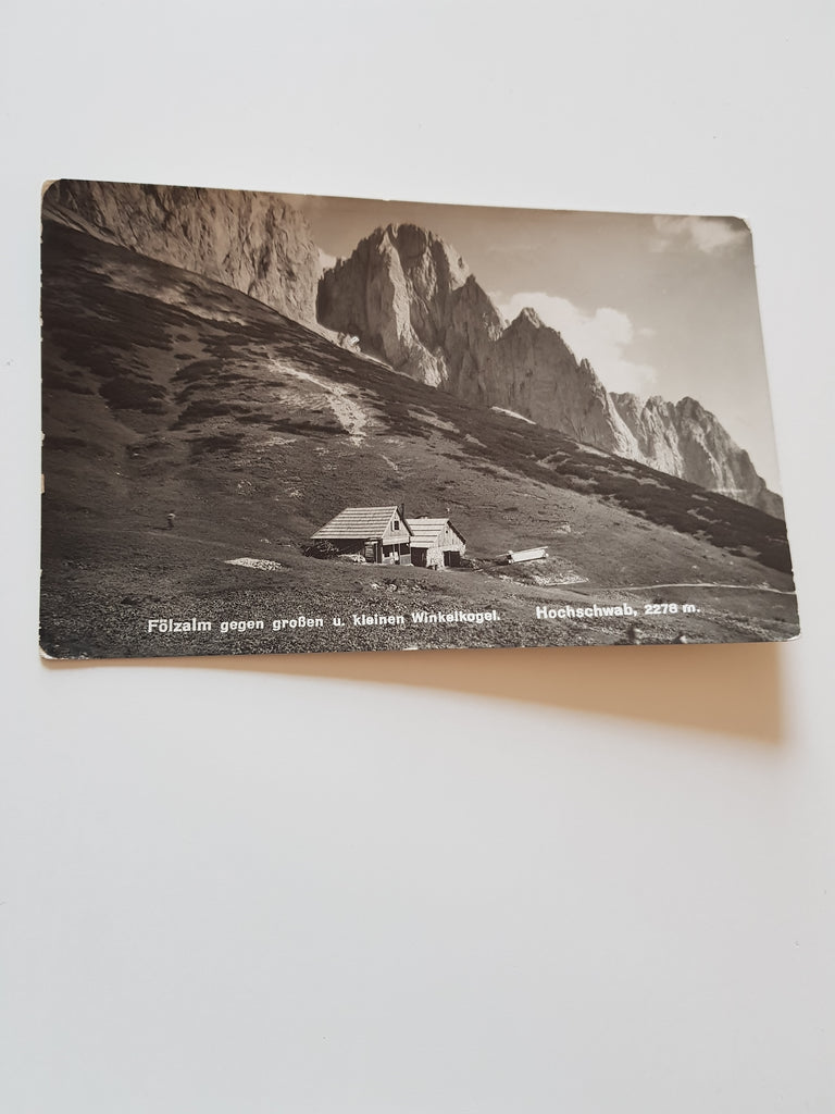 AK Fölzalm gegen großen u. kleinen Winkelkogel. Hochschwab. (1938) Gelaufen. Kleinformat. Verlag: Ledermann. Zustand: linkes unteres Eck angeknickt, Ecken leicht angestoßen.