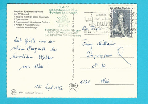 AK Tauplitz Spechtensee. Spechtenseehütte des AV Stainach. Gelaufen. Großformat. Verlag: Rastl. Nummeriert: 949. Zustand: gut.