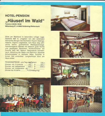 Prospekt Hotel Pension Häuserl im Wald, Mitterberg 27. MM-Verlag: Zustand: fingergriffig, an Falte oben gerissen.