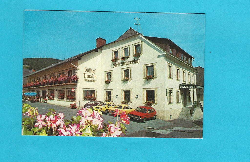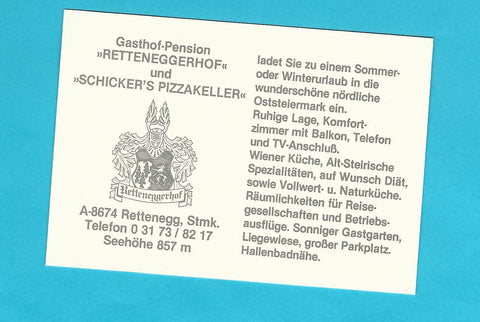 Visitenkarte Rettenegg. Gasthof Pension Retteneggerhof und Schicker's Pizzakeller. Format: 10,3 x 7 cm. Zustand: gut.