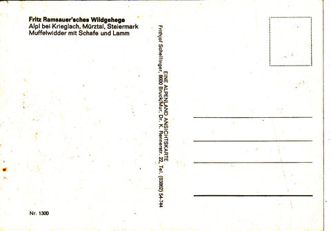 AK Alpl bei Krieglach. Fritz Ramsauer'sches Wildgehege. Muffelwidder mit Schafe und Lamm. Ungelaufen. Großformat. Verlag: Alpenland. Nummeriert: 1300. Zustand: Knicke in der unteren Bildhälfte.