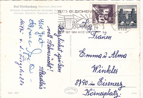 AK Bad Gleichenberg. Gelaufen. Großformat. Verlag: Frank. Nummeriert: 5562-XXII. Zustand: rechtes oberes Eck geknickt und dort am rechten Rand wenig eingerissen, etwas fleckig.