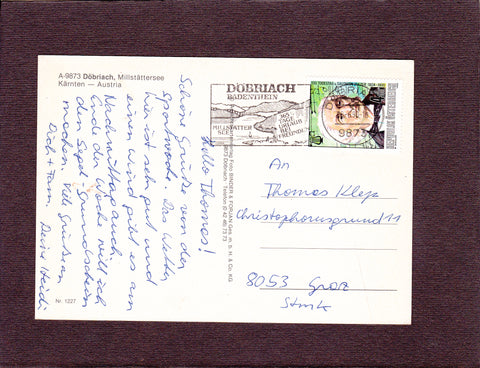 AK Döbriach am Millstättersee. Gelaufen 1990. Großformat. Verlag: Binder & Florian. Nummeriert: 1227. Zustand: gut, linkes oberes Eck angeknickt, andere Ecken wenig angestoßen.