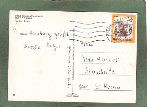 AK Moosburg ...und der Wörther See liegt vor der Tür! Gelaufen 1984. Großformat. Verlag: Schrottshammer. Nummeriert: 56. Zustand: rechtes oberes Eck geknickt, Ecken leicht angestoßen.