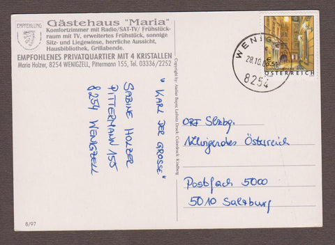 AK Wenigzell. Gästehaus Maria. Pittermann 155. Gelaufen. Großformat. Verlag: Bayer. Nummeriert: 8/97. Zustand: leichter Knick über dem rechten unteren Bild, Knick am unteren Rand beim linken Eck, sonst O.K.