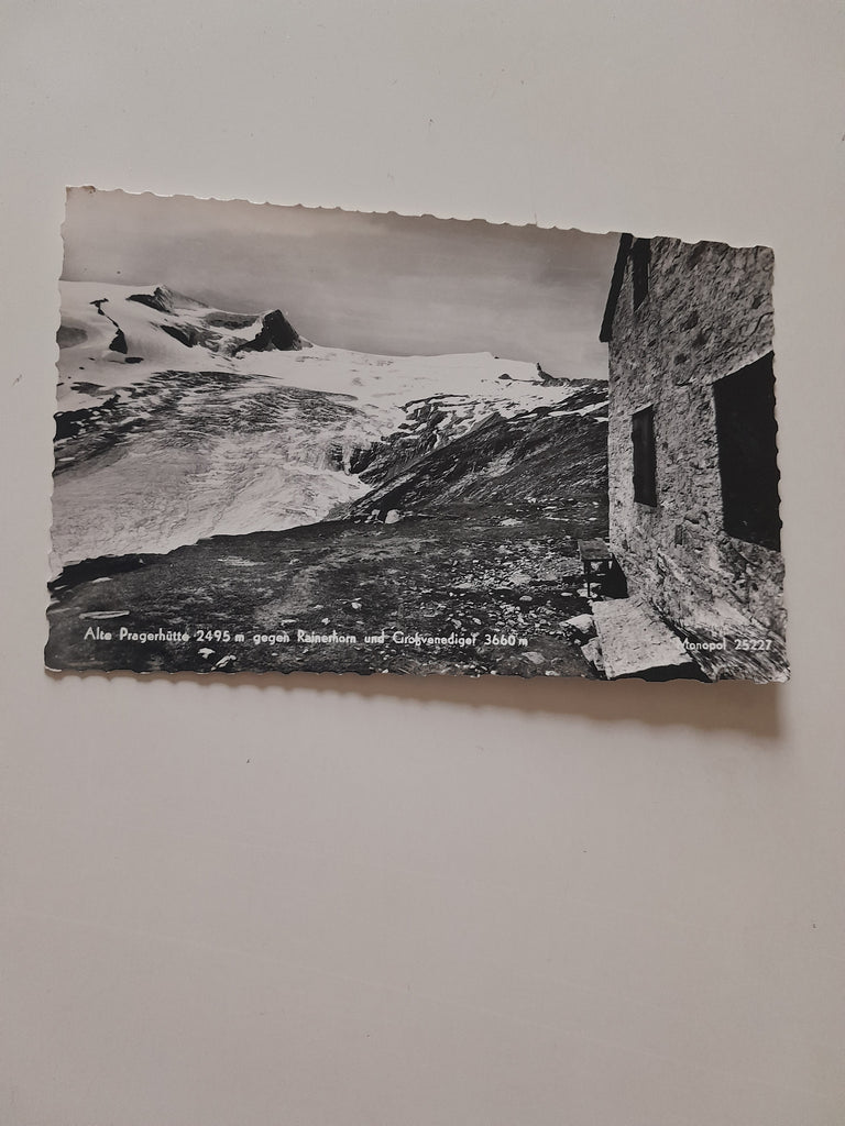 AK Alte Pragerhütte gegen Rainerhorn und Großvenediger. Gelaufen. Kleinformat. Verlag: Monopol. Nummeriert: 25227. Zustand: gut, rechtes unteres Eck angeknickt.