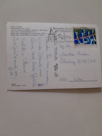 AK Lienz mit Schigebiet Zettersfeld. Gelaufen. Großformat. Verlag: zloebl. Nummeriert: 39675. Zustand: gut, rechtes oberes Eck geknickt.