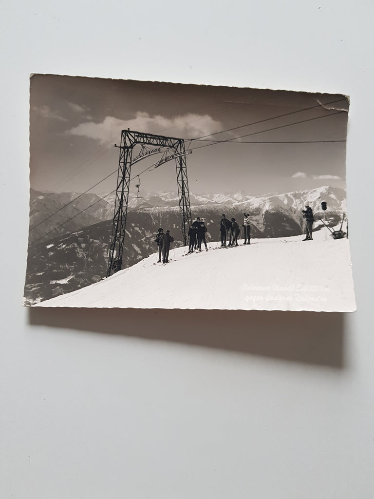AK Steinerne Mandl Lift gegen Sextener Dolomiten. Gelaufen. Großformat. Verlag: Stiegler. Zustand: rechtes oberes Eck geknickt.