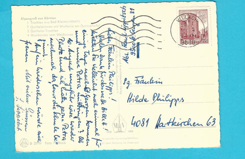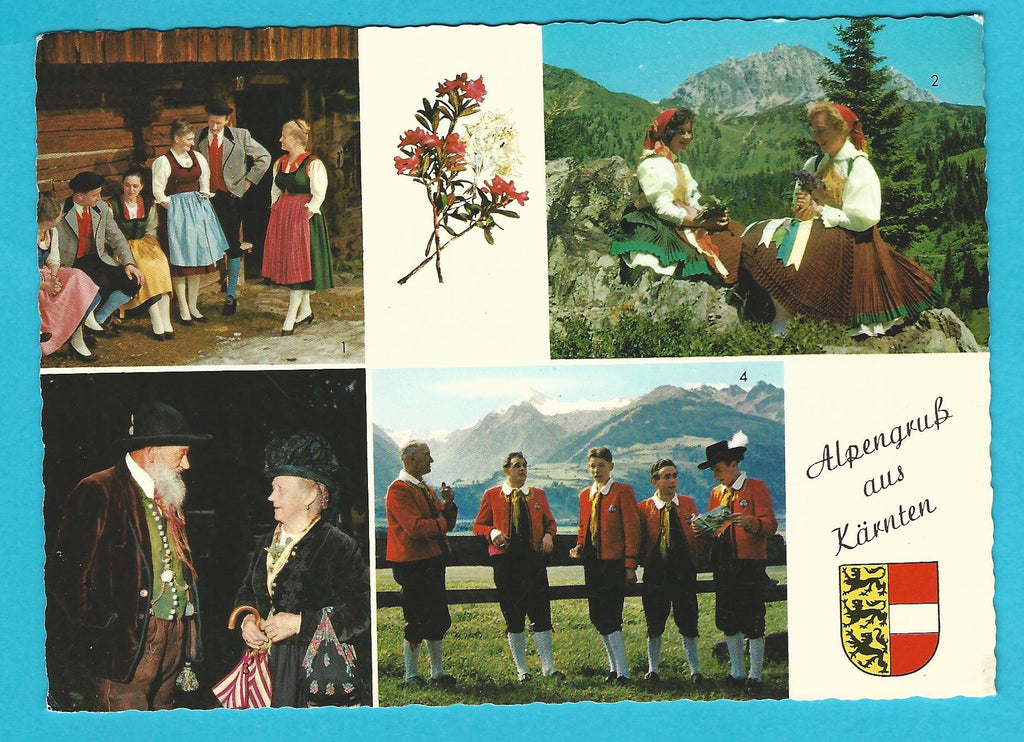 AK Alpengruß aus Kärnten. Trachten aus Bad Kleinkirchheim. Hailtalerinnen mit Wulfenia am gartnerkofel Gailtaler Trachten Musikanten vom Weißensee. Gelaufen. Großformat. Verlag: Monopol. Nummeriert: D 25704. Zustand: gut, rechtes oberes Eck geknickt.