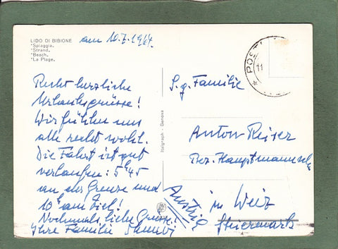AK Lido di Bibione. Spiaggia. Gelaufen, 1964, aber Briefmarke wurde entfernt. Großformat. Verlag: Italgraph. Nummeriert: 5333. Zustand: an Rändern etwas bestoßen.