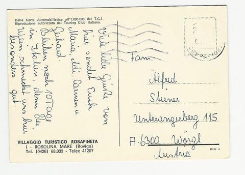 AK Villaggio Turistico Rosapineta. Rosolina Mare. Gelaufen, aber Briefmarke wurde entfernt. Großformat. Nummeriert: 4. Zustand: leichte Läsuren.