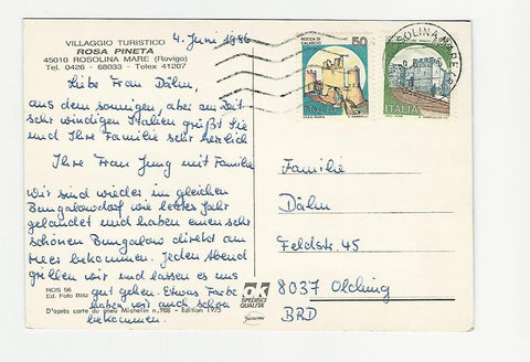 AK Villaggio Turistico Rosapineta. Rosolina Mare. Gelaufen. Großformat. Verlag: Blitz. Nummeriert: 56. Zustand: linkes unteres Eck doppelt geknickt, sonst O.k.
